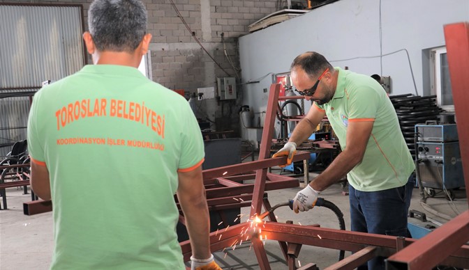 Toroslar Belediyesi Koordinasyon İşleri Müdürlüğü bünyesinde bulunan demir, boyahane, marangoz ve kaynak atölyelerinde belediye personeli tarafından titizlikle üretilen malzemeler, ilçedeki park ve yeşil alanlar ile ihtiyaç duyulan noktalara yerleştiriliyor. Atölyelerde, basketbol ve futbol sahaları, engelli rampası ile mülkiyeti belediyeye ait olan muhtarlıkların çatı onarımları ve bakımları da yapılıyor.