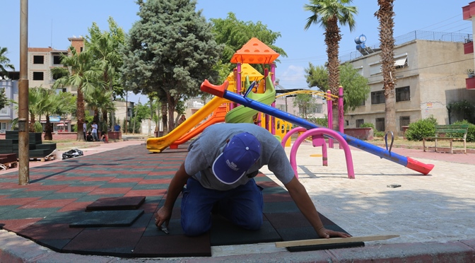 Belediye ekipleri, çocukların daha sağlıklı ve güvenli ortamlarda oyun oynayarak keyifli zaman geçirmeleri amacıyla da muhtelif parkların zeminini kauçuk ile kaplıyor. Kauçuk zemin uygulaması ile parklar daha estetik ve modern bir görünüme kavuşuyor.