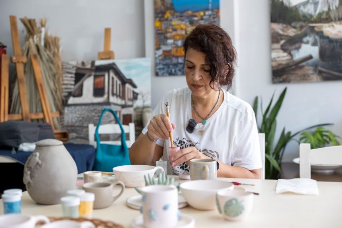 Sanat yolculuğuna yaklaşık 15 yıl önce başlayan, pandemi ile birlikte seramik üretimine yönelen kadın üreticilerden Zeycan Yırtıcı da Büyükşehir’in stantlarında yer bulma fırsatı bulan girişimciler arasında. Tamamen el emeği ile şekillendirdiği ürünlerine özgün desenler işleyen üretici, hiçbir baskı kullanmadan ve kendi çizimleriyle seramik ürünlerine değer katıyor. Yıllardır hayalini kurduğu atölye kurma fikrini gerçeğe dönüştüren Yırtıcı, seramik ürünlerin yanı sıra; bambu, yağlı boya ve farklı el işi ürünlerini de atölyesinde sergiliyor.